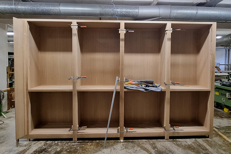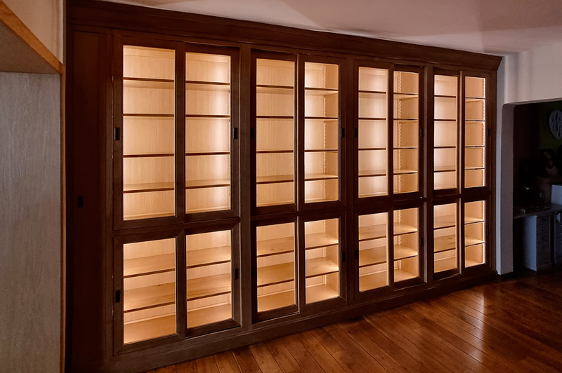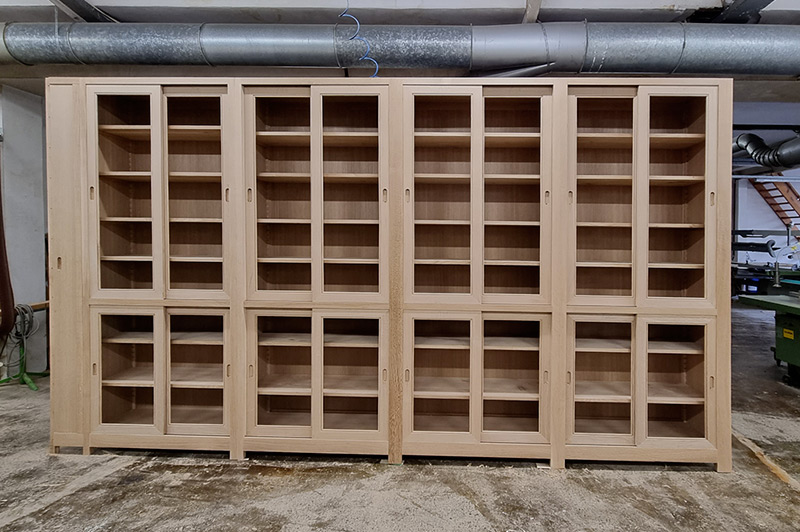 Toutes portes coulissantes et en verre, planches sur crémaillères.