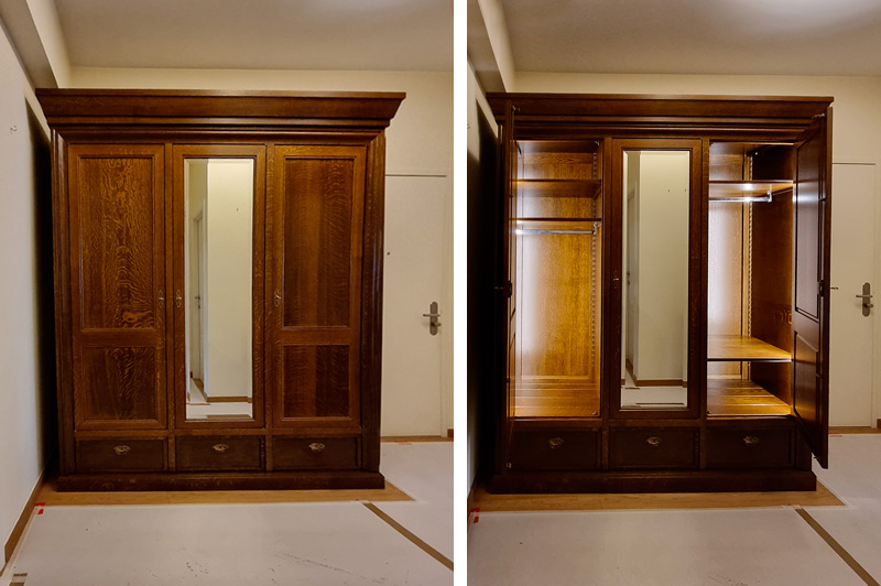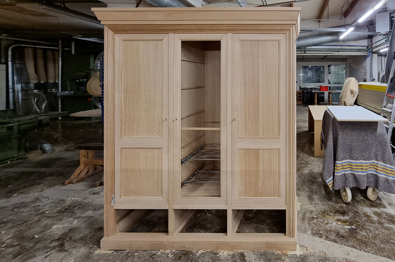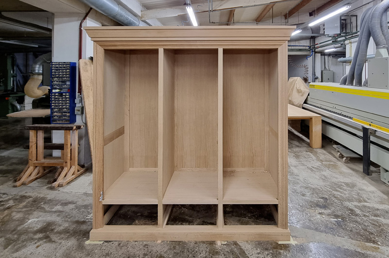 Meuble en chêne massif et semi-massif, 3 portes dont 1 miroir.