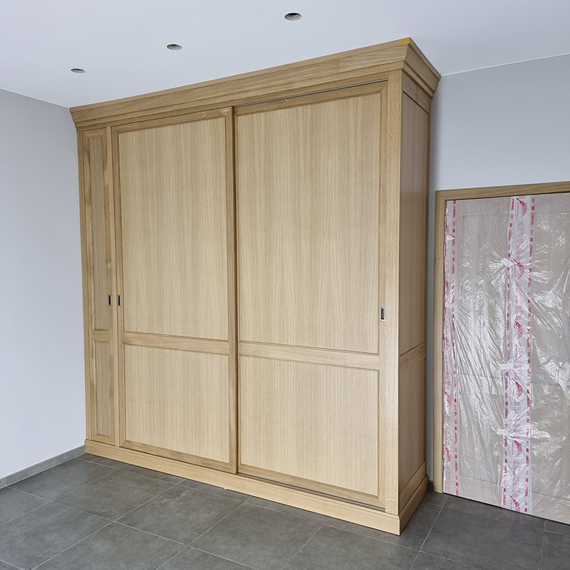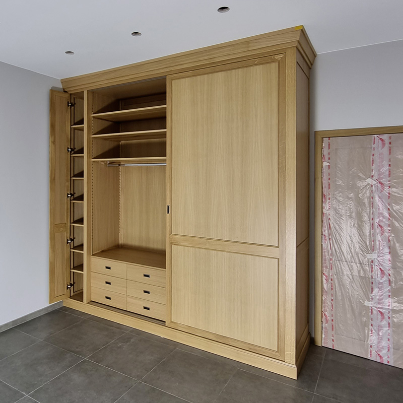 Meuble chêne massif et semi-massif, 1 porte sur charnières type cuisine et 2 portes coulissantes avec raidisseurs.
