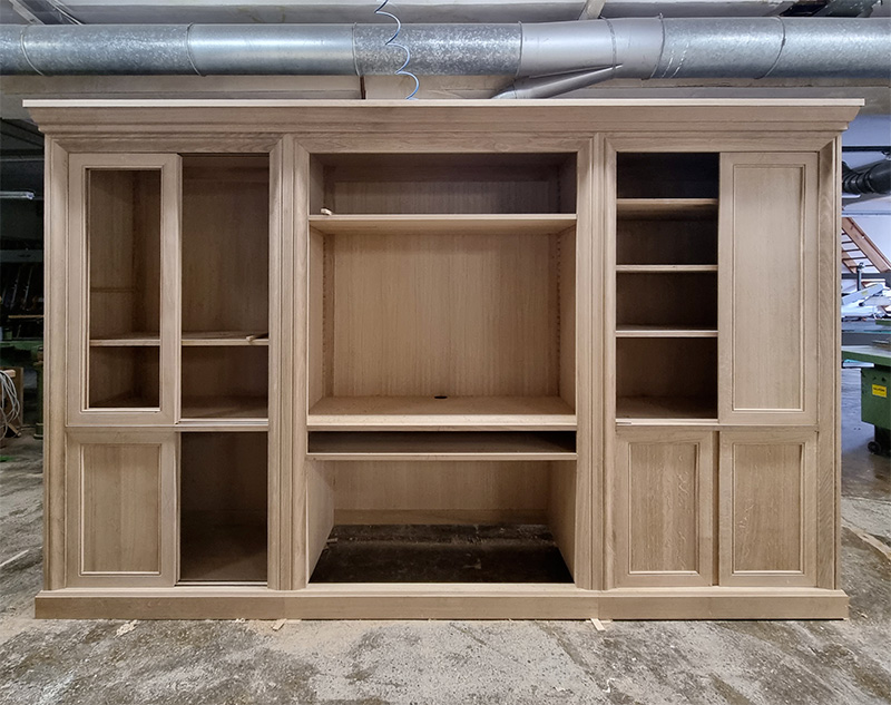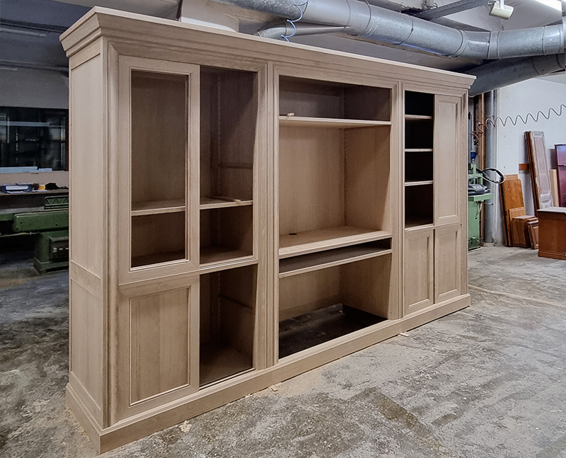 Côté gauche: bas 2 portes bois sur pivots décallés avec 1 planche sur crémaillères et haut 2 portes bois sur pivots décallés avec 3 planches sur crémaillères.