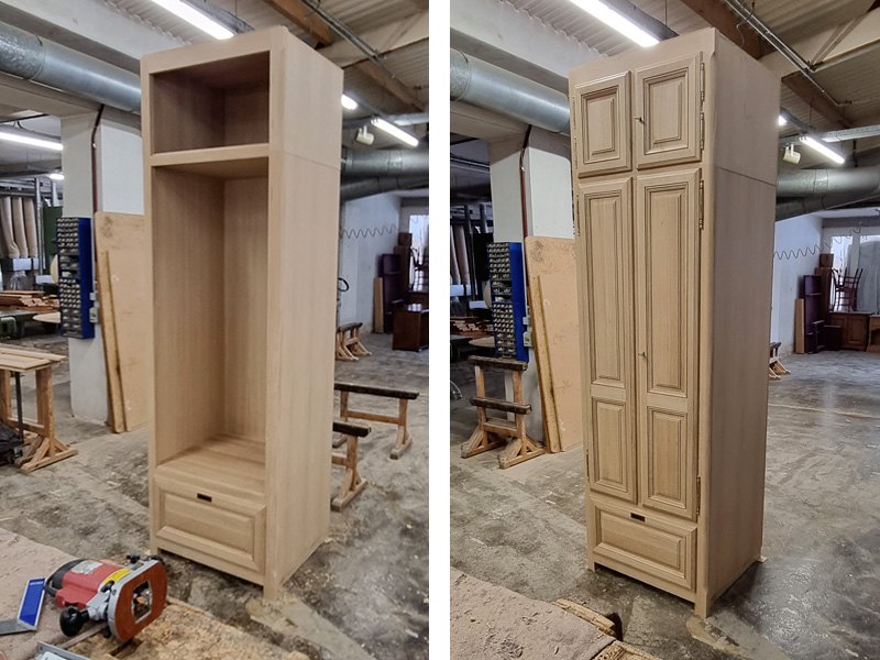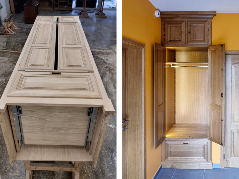 Vestiaire en chêne massif et semi massif, 1 grand tiroir à chaussures sur coulisses métalliques, 2 portes avec éclairage et 1 planches avec barre de penderie sur crémaillères et 2 portes hautes.
